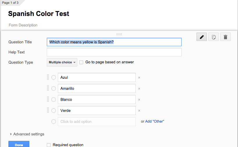 I’ve created a basic form here that shows this in action with Spanish colours. Notice that if you get the answer correct you receive positive reinforcement and can submit your answer, but if you get it wrong you can watch a support video then try again. This is just one additional way to support students when they are completing work outside of the classroom.