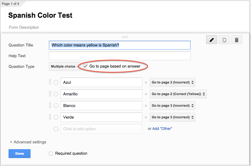 - Set answers to take users to the appropriate page. Do this by going back to the question and checking the box labelled “Go to page based on answer”. Then simply choose the page each answer should take students to.